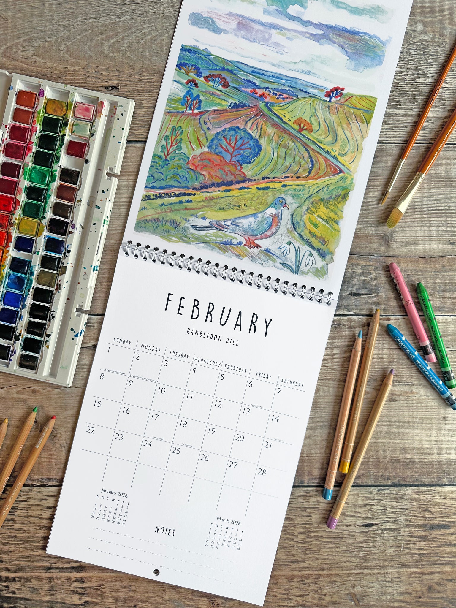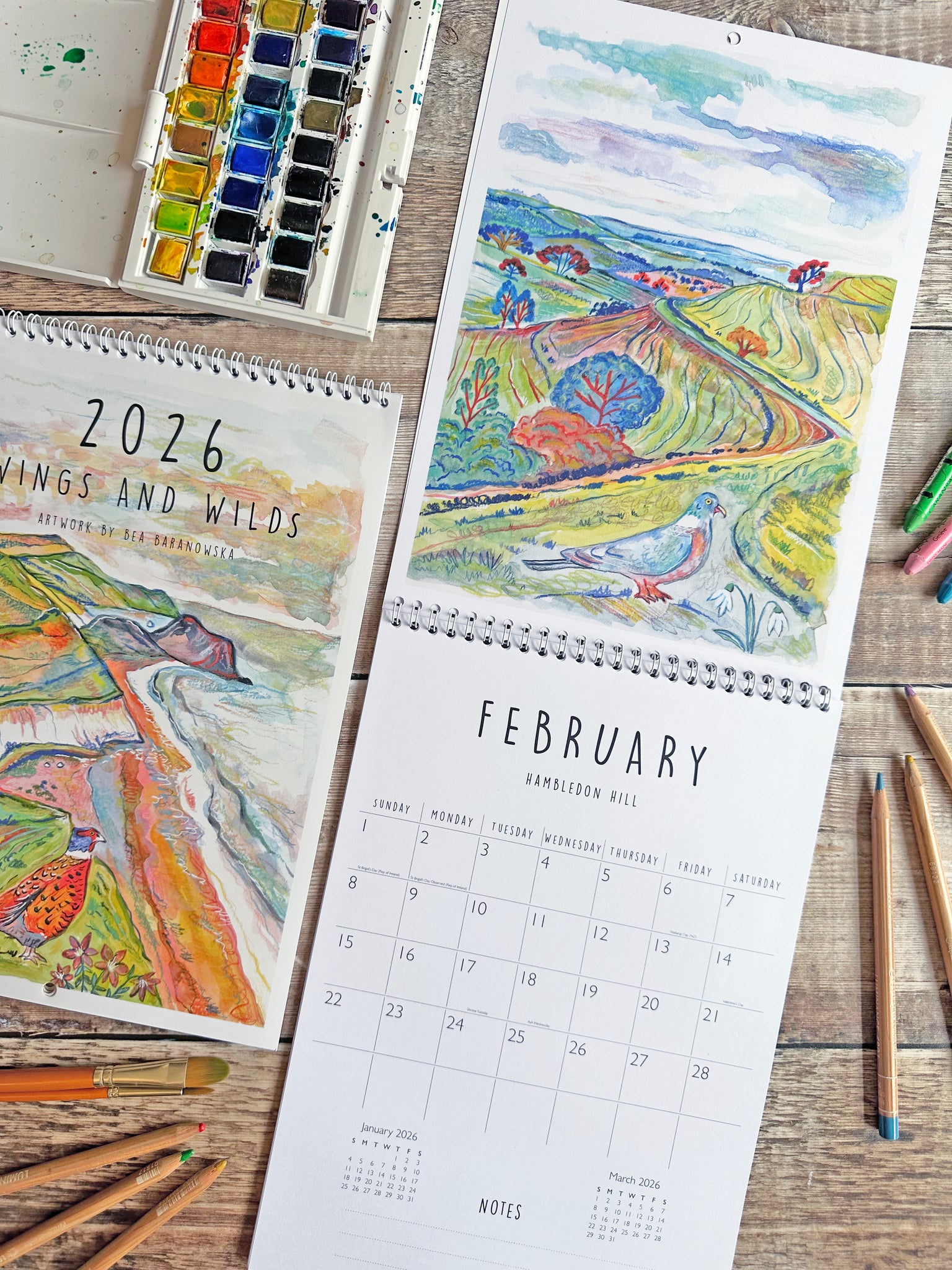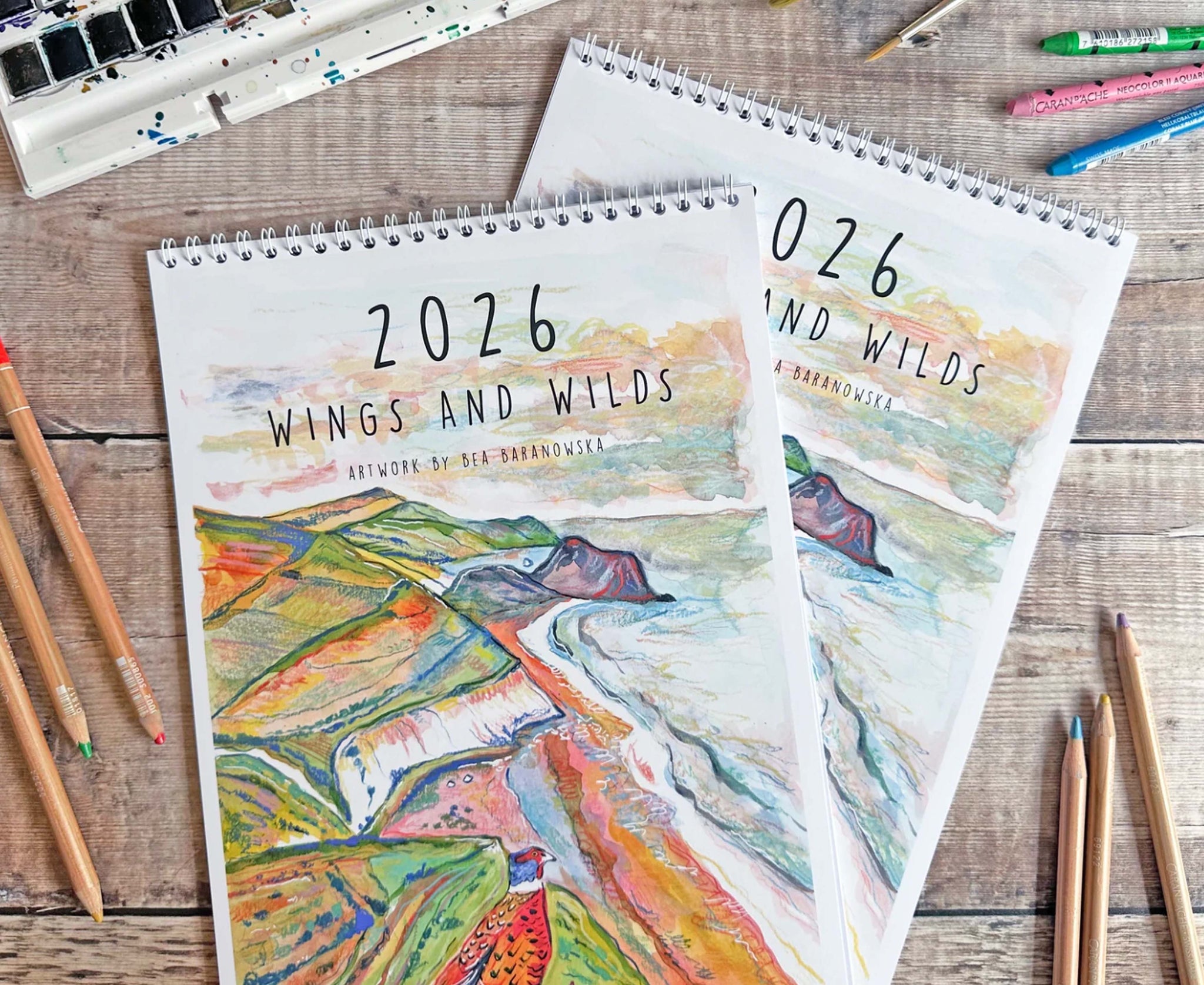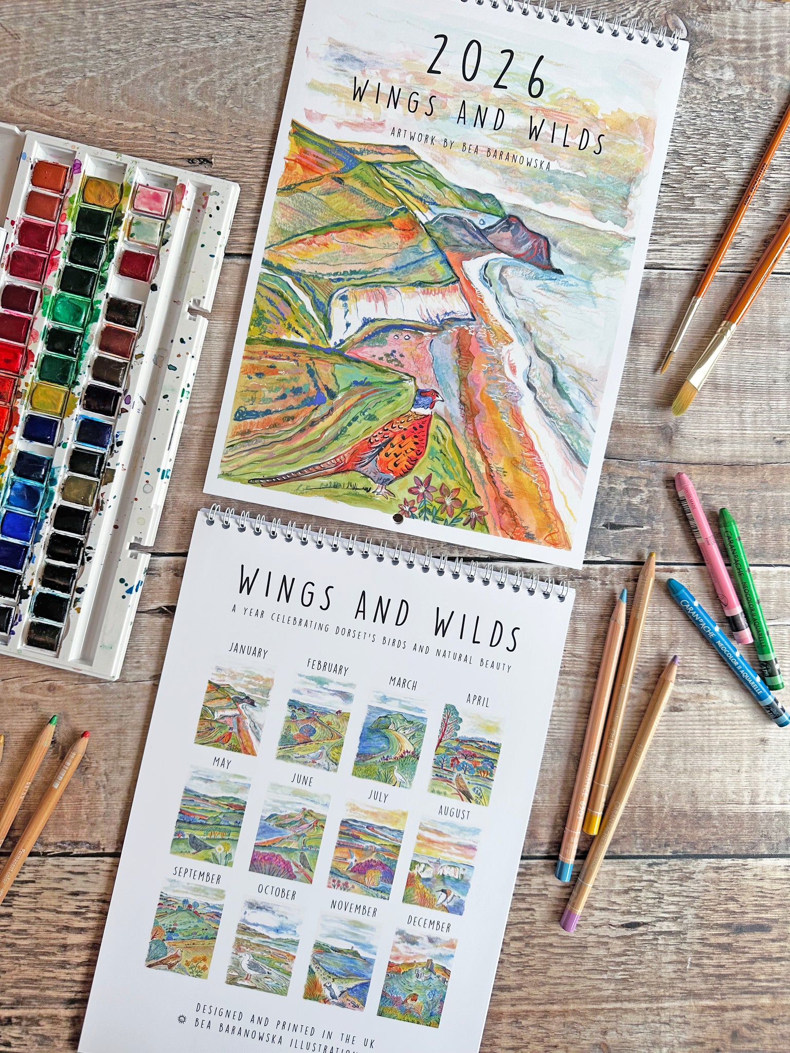 The 2026 Wings & Wilds Calendar, featuring 12 hand painted illustrations for each month of the year, with a lovely selection of images featuring Dorset landscapes and birds. The prints have been designed so at the end of the year you can trim off the pages and frame your favourites.