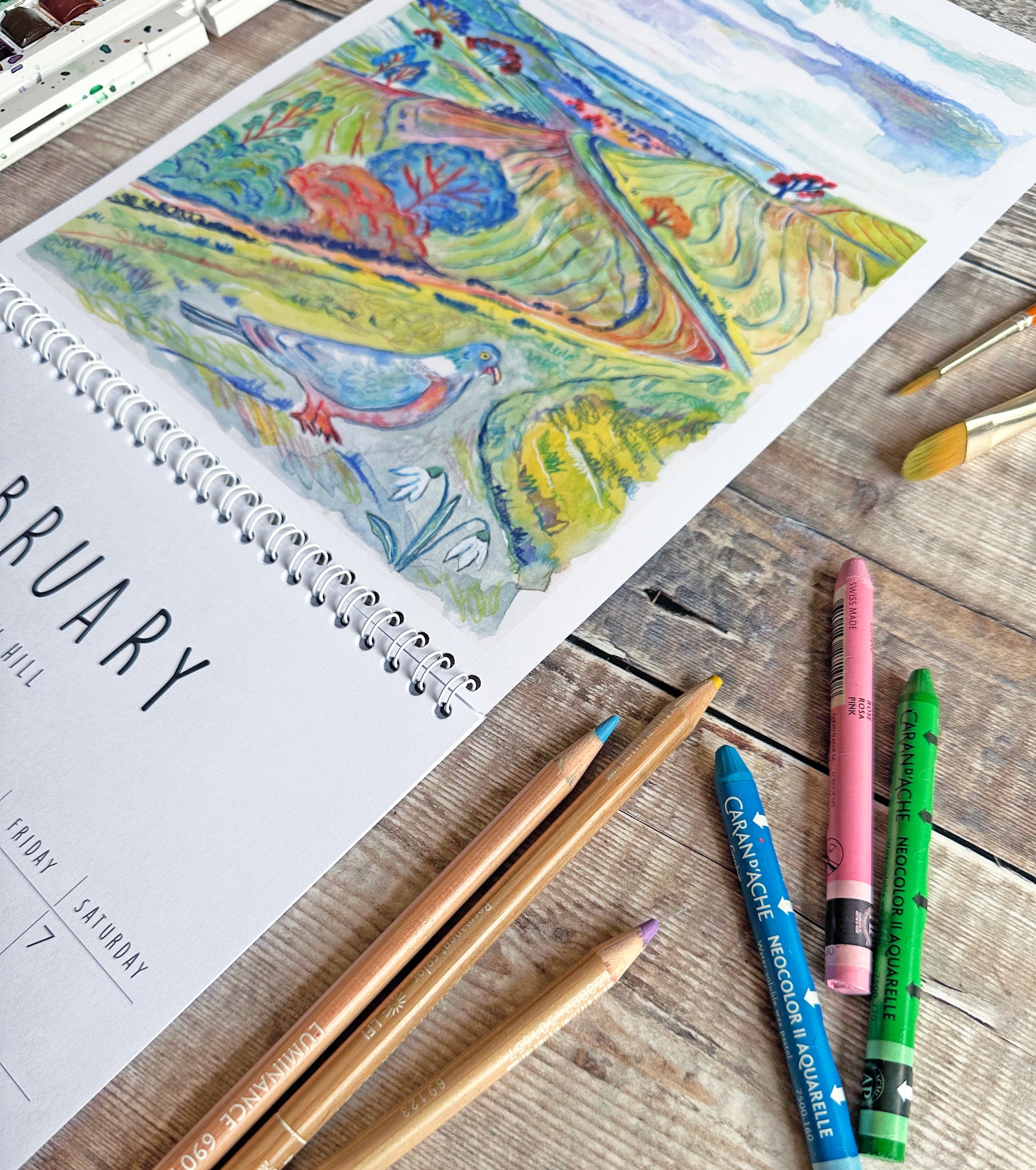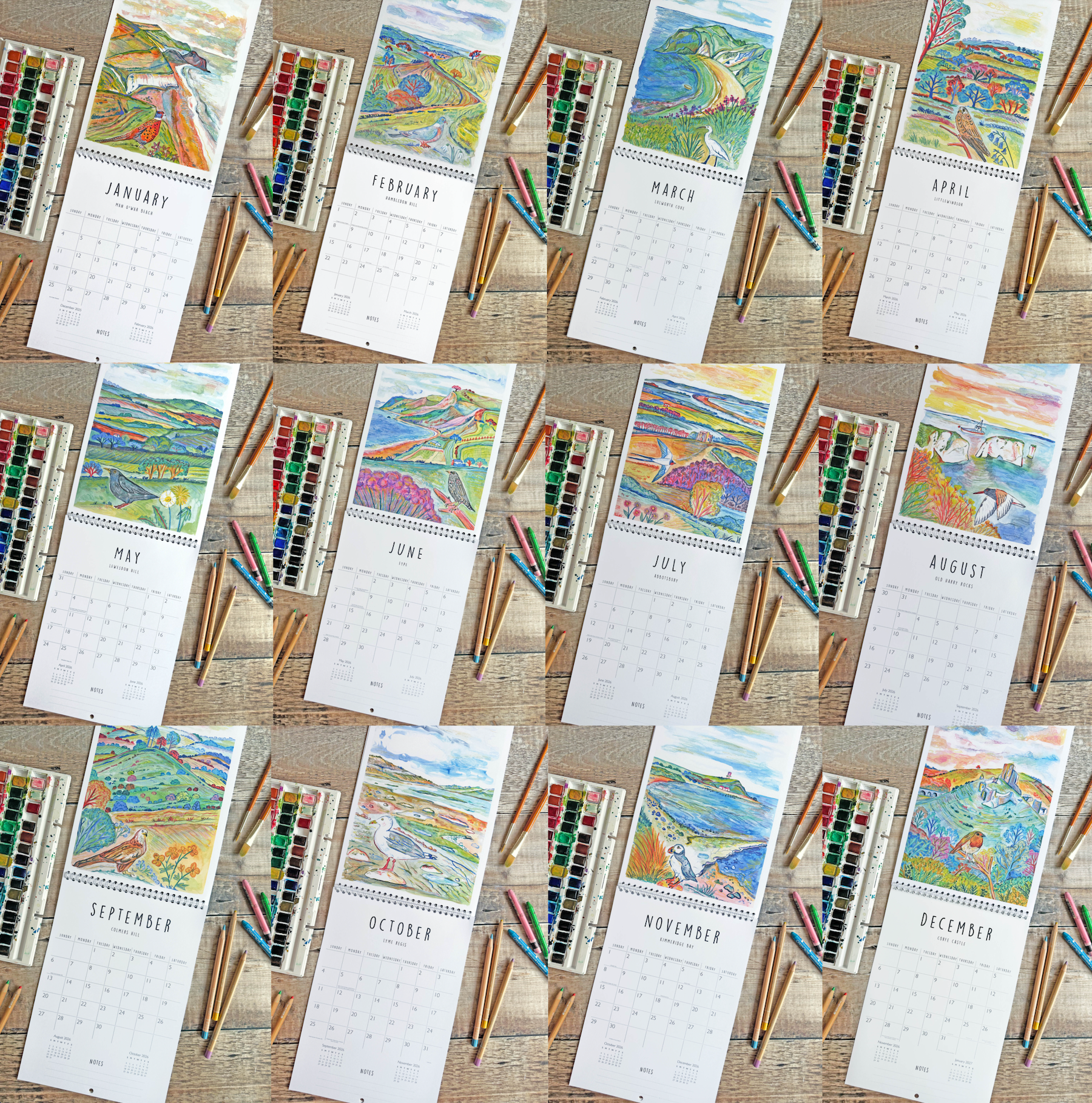The theme for this years calendars is the Wings & Wilds. Since moving to Dorset in the Spring, I've been so inspired by rolling hills, coastal trips and my new garden filled with birds. I set about drawing some of these scenes straight away, and from there the calendar took flight.