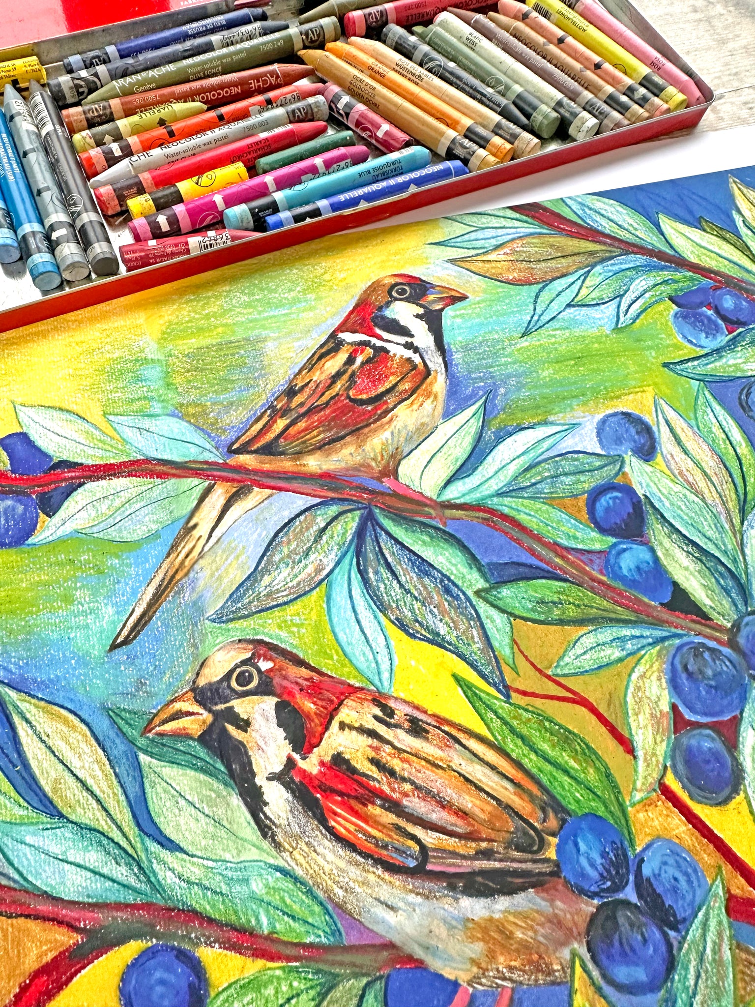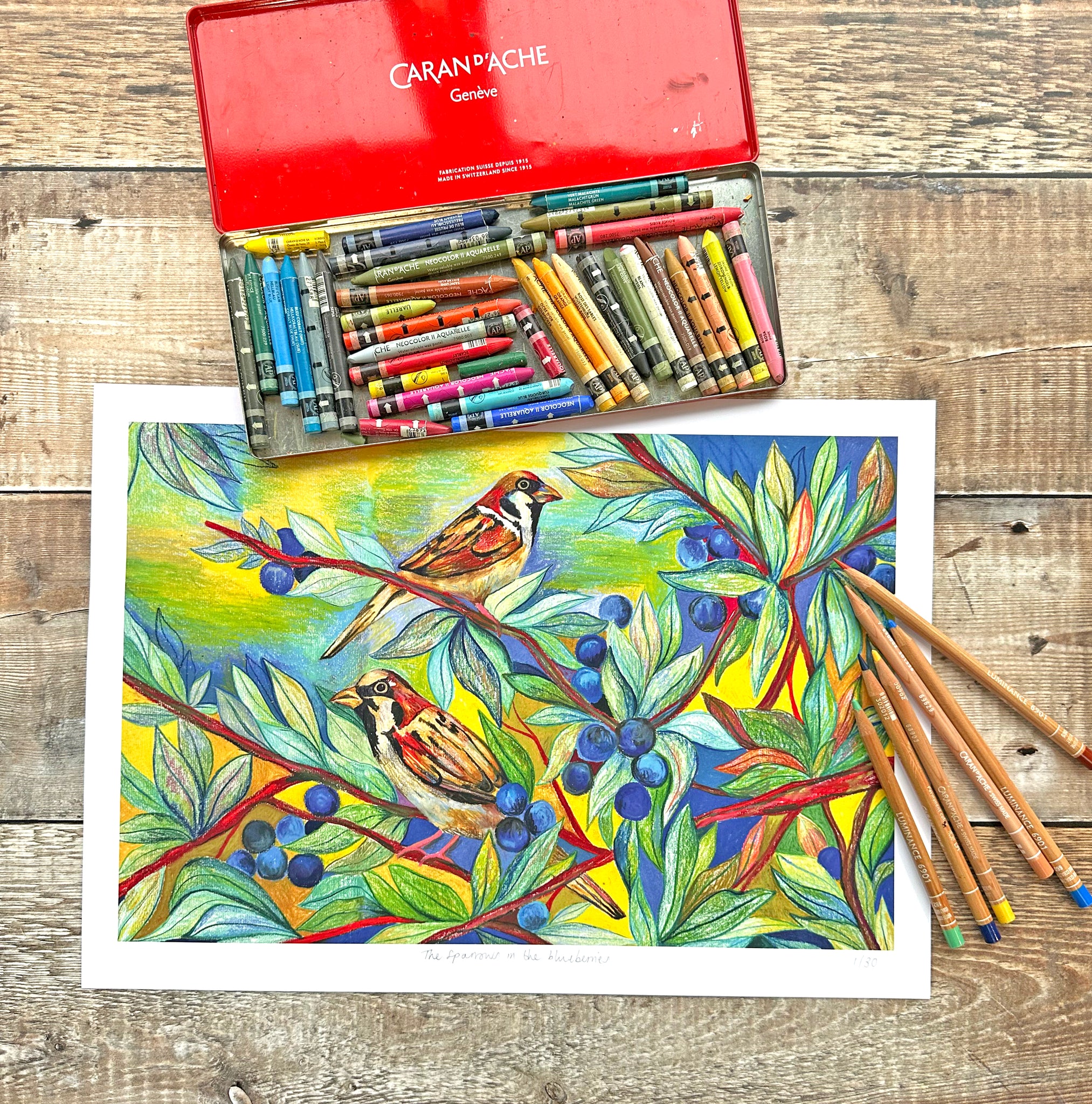 This drawing was created using Caran'dache luminance pencils and neocolor pastels. Once the drawing was complete, It was scanned in at a very high resolution in order to retain all the details and textures from the original drawing. It has then been cleaned up in photoshop, and Giclee printed for lightfastness on 280gsm paper. The colours of the prints are vibrant and bold, replicating the original drawing as closely as possible.
