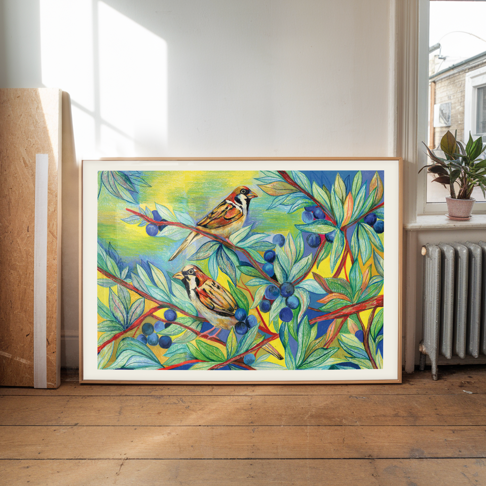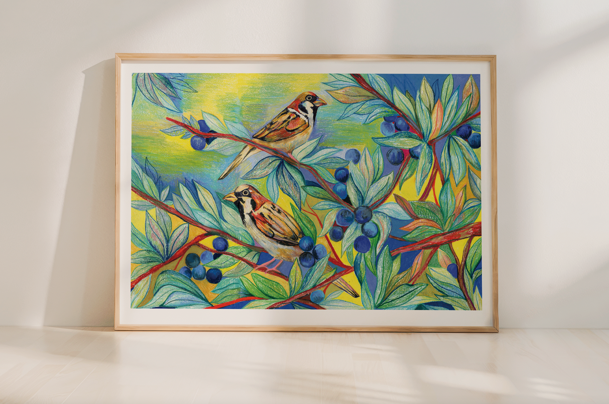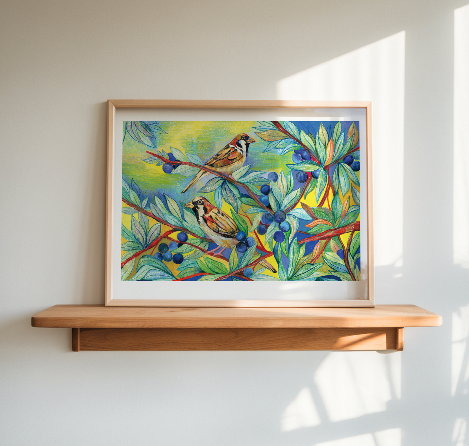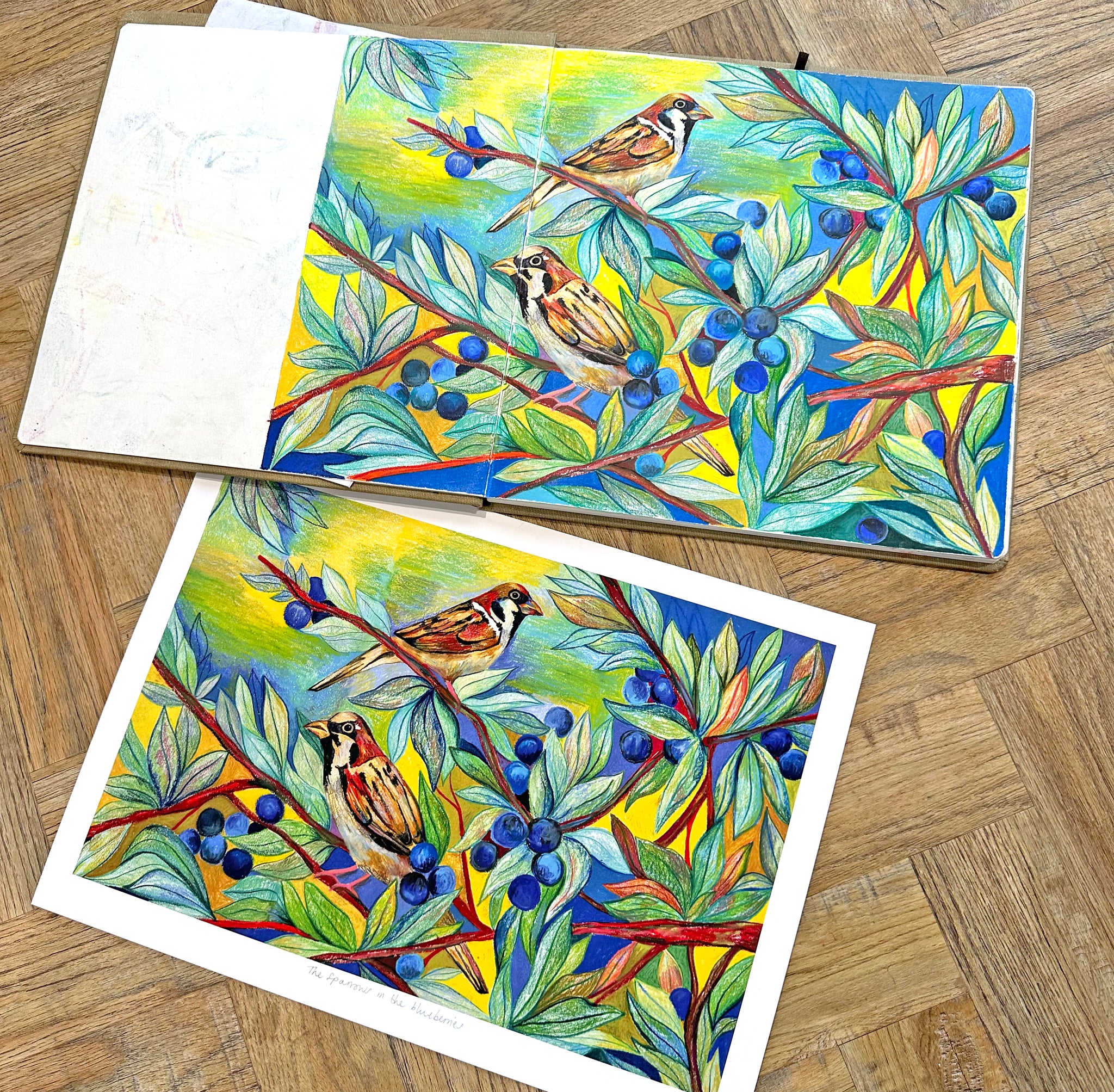 This is a limited edition print, replicated from my original drawing of the sparrows and the blueberries. There are 30 prints in the edition.