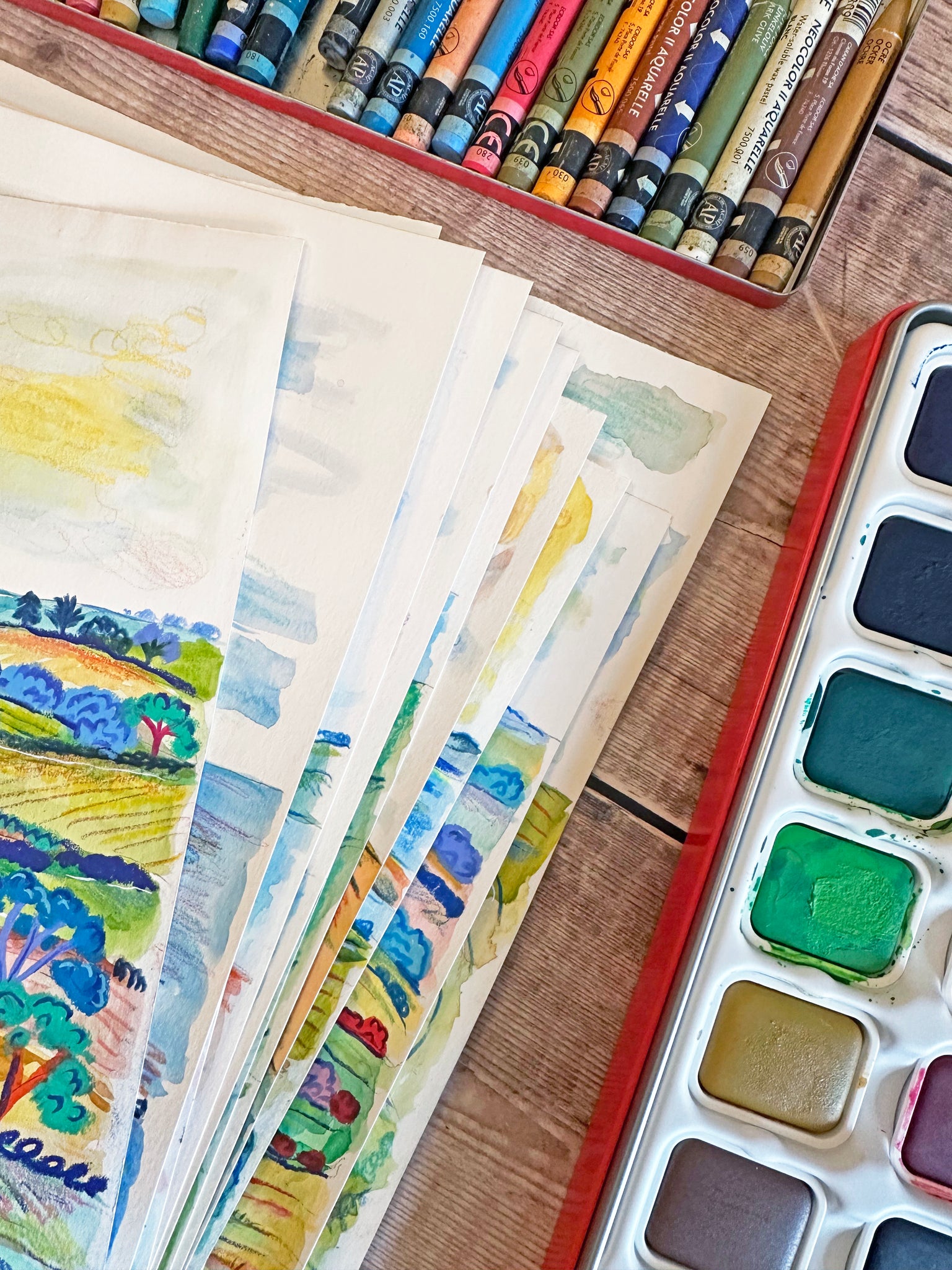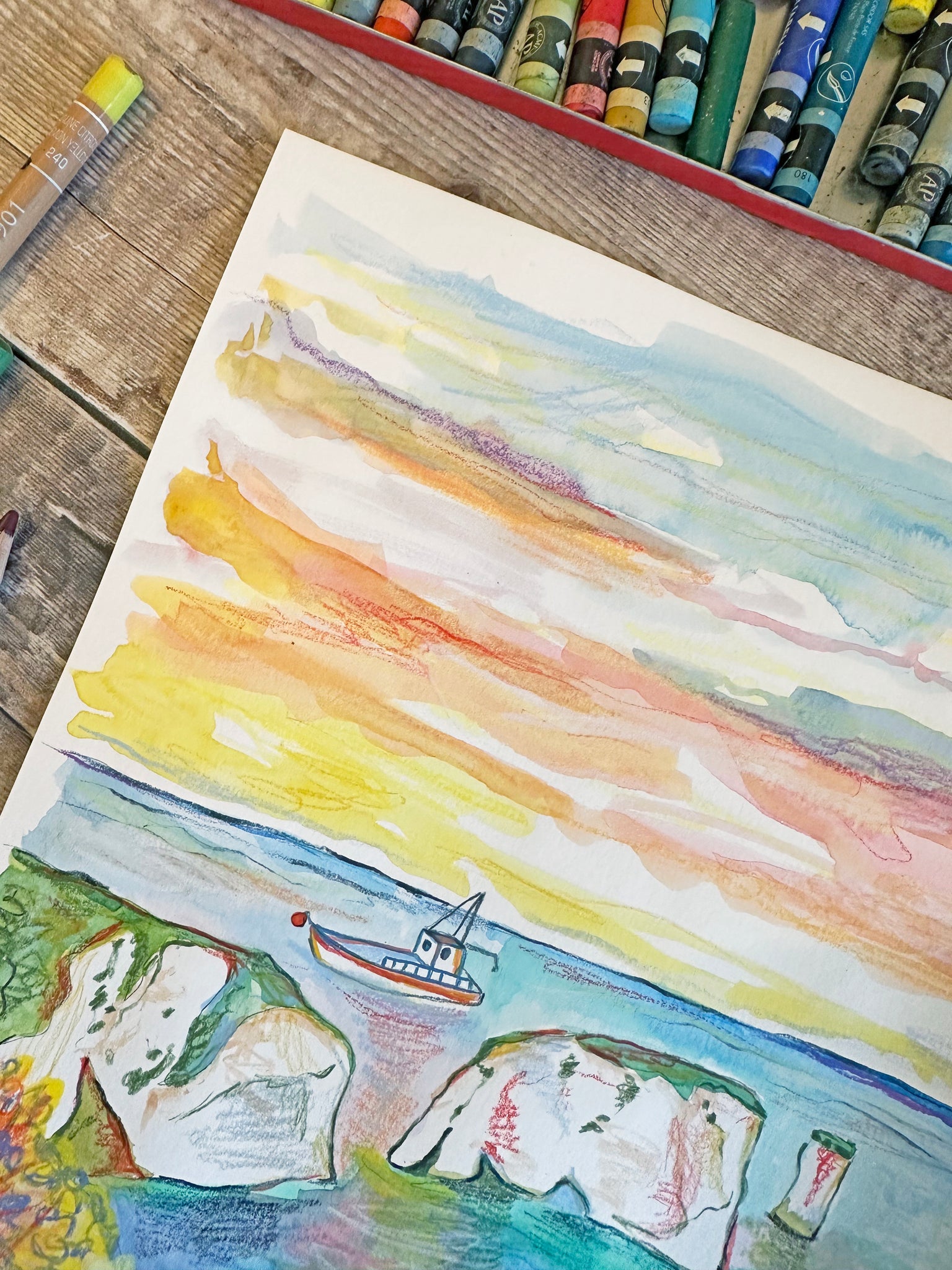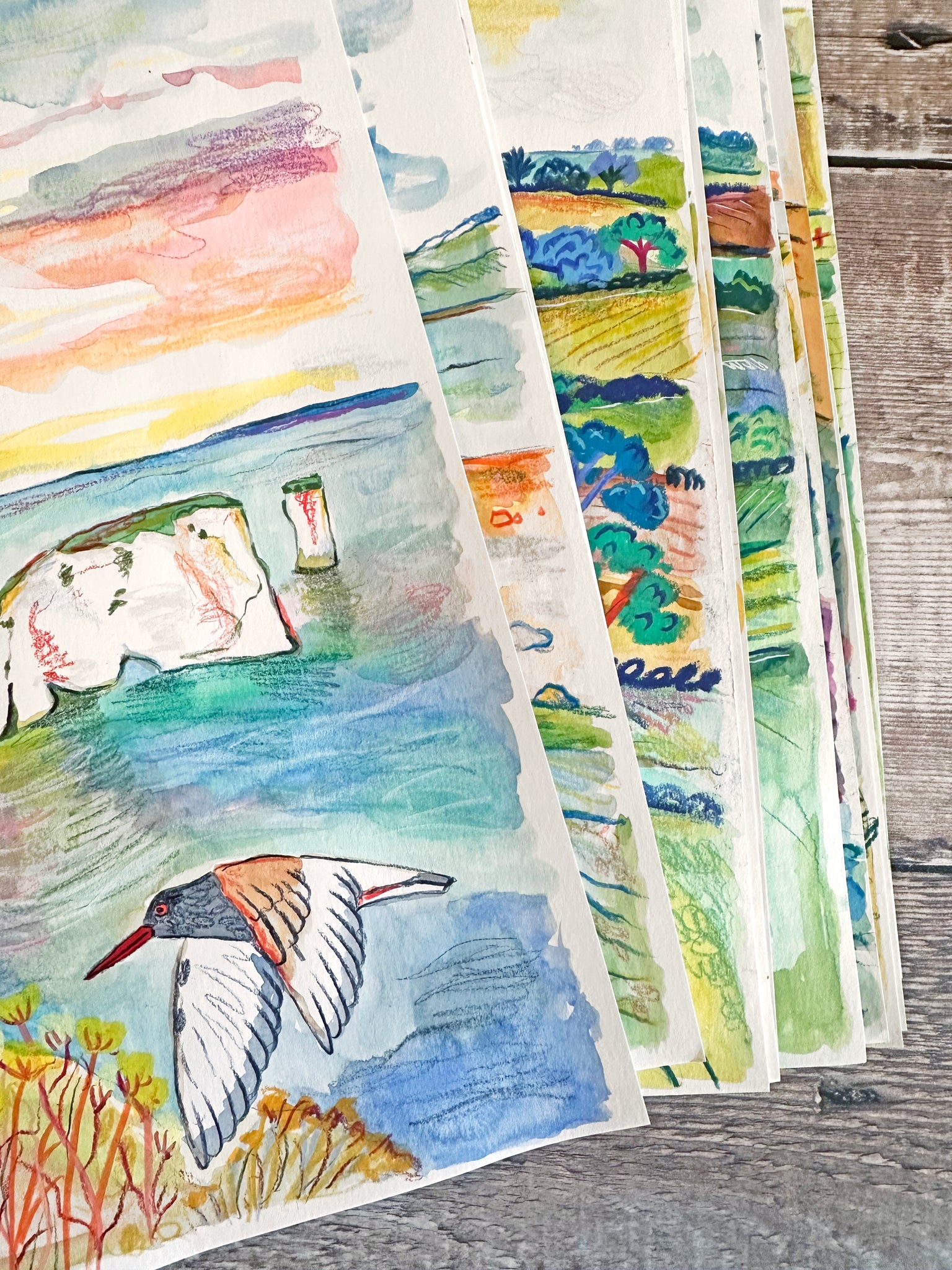 I created this painting using watercolour paints and Caran d’ache neocolor pastels and luminance pencils. These materials are archival and lightfast meaning the colours will not fade if looked after properly. I start by creating a soft watercolour wash for the background, and once this is dry I gradually build up the details with pencils, pastels and Posca markers. This creates a lovely depth and texture to the piece. If you look really closely you can see all the different layers. I love to use bold colours to really capture the essence of the place. These pieces can be preserved properly by keeping them out of direct sunlight and framing them behind filter glass or acrylic. I have used 220gsm smooth heavyweight watercolour paper, which is acid free, and the pictures are then sprayed with a matt varnish fixative designed to preserve your artwork from any smudging or water damage. Your print will come unframed and un-mounted, backed by greyboard and packaged in a recyclable cello sleeve to protect it from any water damage. Your print will be signed and come with an artist certificate of authentication.
