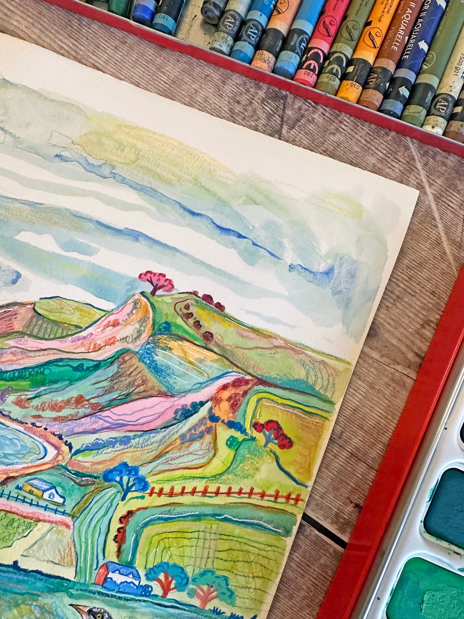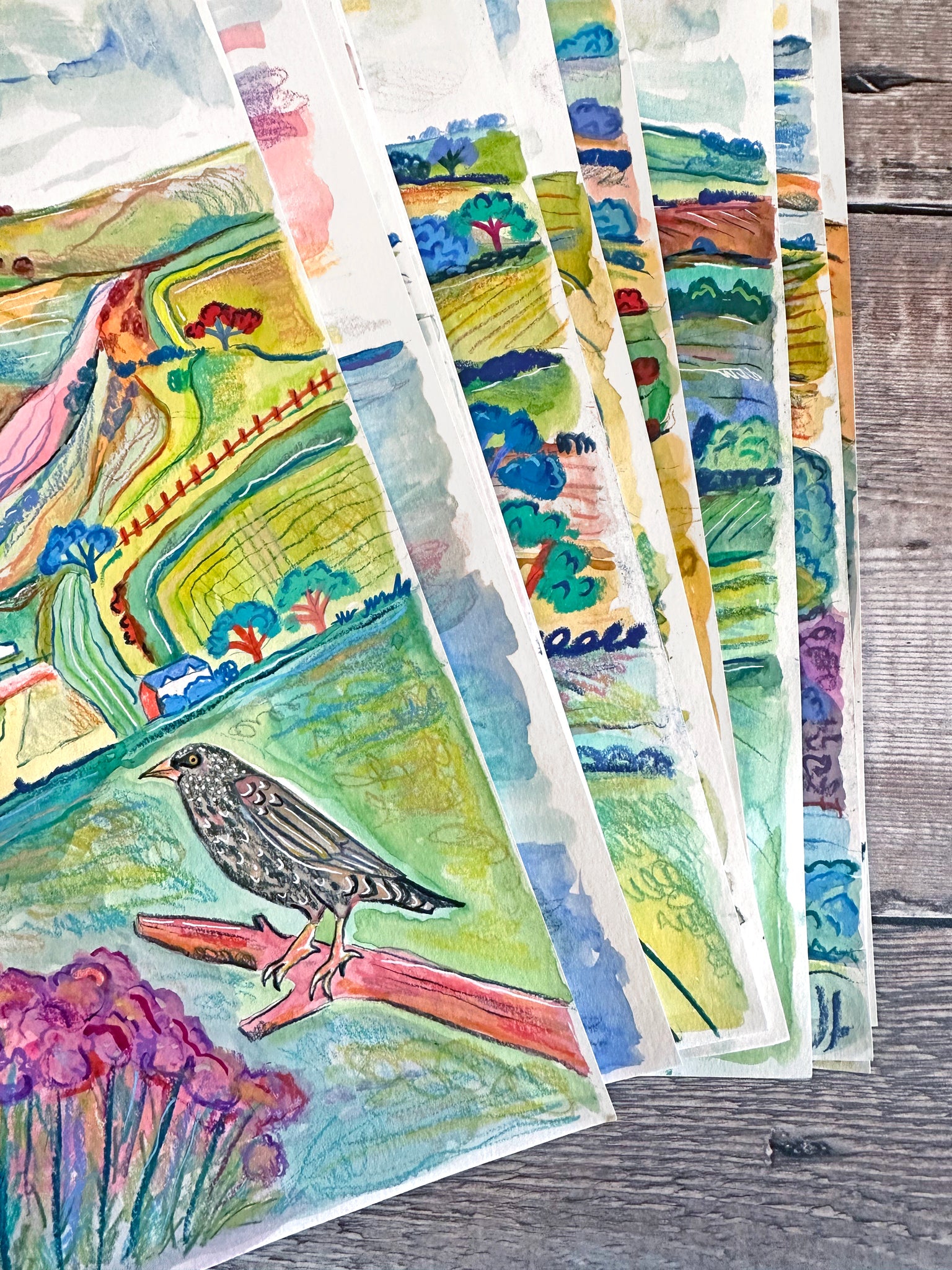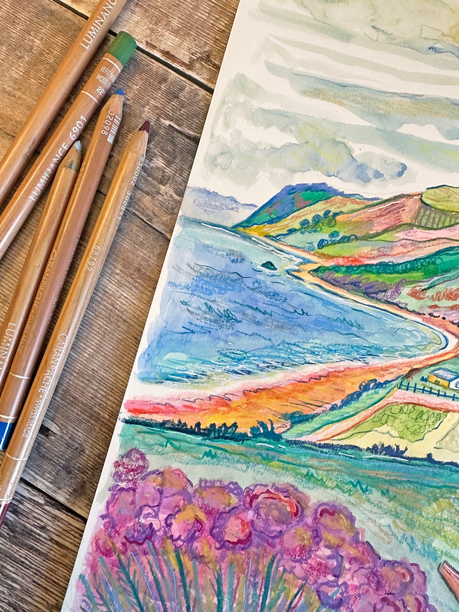 I created this painting using watercolour paints and Caran d’ache neocolor pastels and luminance pencils. These materials are archival and lightfast meaning the colours will not fade if looked after properly. I start by creating a soft watercolour wash for the background, and once this is dry I gradually build up the details with pencils, pastels and Posca markers. This creates a lovely depth and texture to the piece. If you look really closely you can see all the different layers. I love to use bold colours to really capture the essence of the place. These pieces can be preserved properly by keeping them out of direct sunlight and framing them behind filter glass or acrylic. I have used 220gsm smooth heavyweight watercolour paper, which is acid free, and the pictures are then sprayed with a matt varnish fixative designed to preserve your artwork from any smudging or water damage. Your print will come unframed and un-mounted, backed by greyboard and packaged in a recyclable cello sleeve to protect it from any water damage. Your print will be signed and come with an artist certificate of authentication.