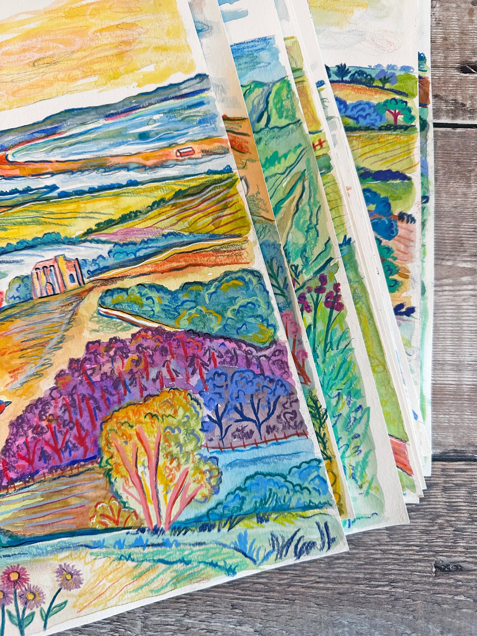 I created this painting using watercolour paints and Caran d’ache neocolor pastels and luminance pencils. These materials are archival and lightfast meaning the colours will not fade if looked after properly. I start by creating a soft watercolour wash for the background, and once this is dry I gradually build up the details with pencils, pastels and Posca markers. This creates a lovely depth and texture to the piece. If you look really closely you can see all the different layers. I love to use bold colours to really capture the essence of the place. These pieces can be preserved properly by keeping them out of direct sunlight and framing them behind filter glass or acrylic. I have used 220gsm smooth heavyweight watercolour paper, which is acid free, and the pictures are then sprayed with a matt varnish fixative designed to preserve your artwork from any smudging or water damage. Your print will come unframed and un-mounted, backed by greyboard and packaged in a recyclable cello sleeve to protect it from any water damage. Your print will be signed and come with an artist certificate of authentication.