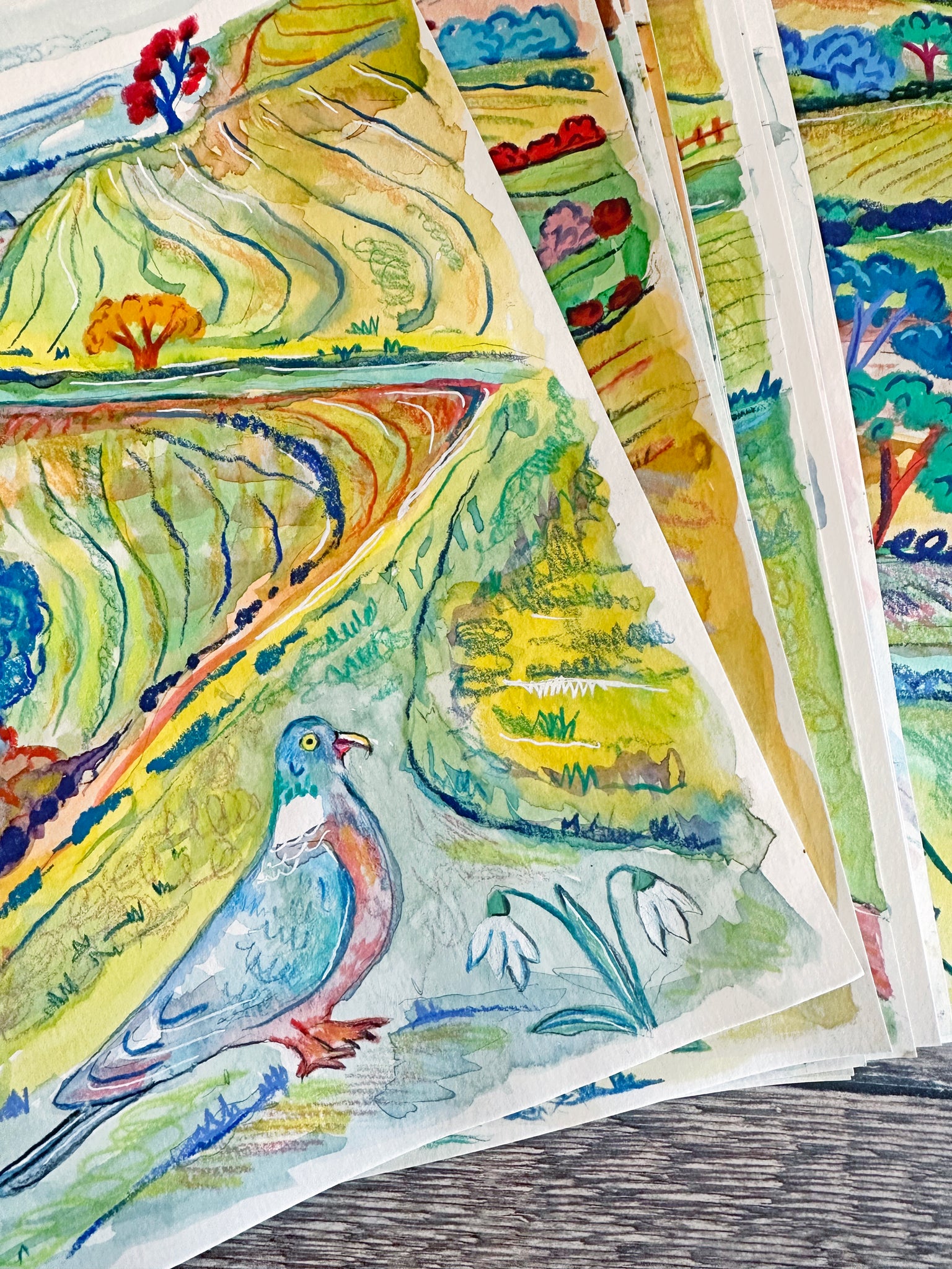 This is an original one of a kind painting of Hambledon Hill in Dorset. It features a Pigeon and some snowdrops in the foreground.
